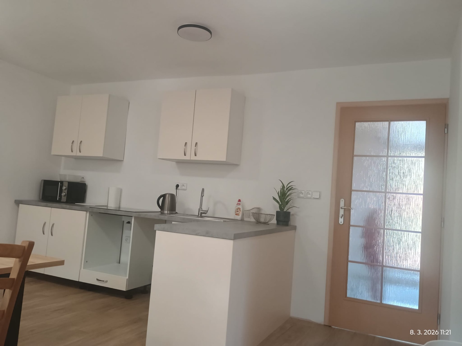 Společenská místnost se stolem až pro osm osob. Rozkládací gauč, lednička, pračka a kuchyň s indukční deskou.